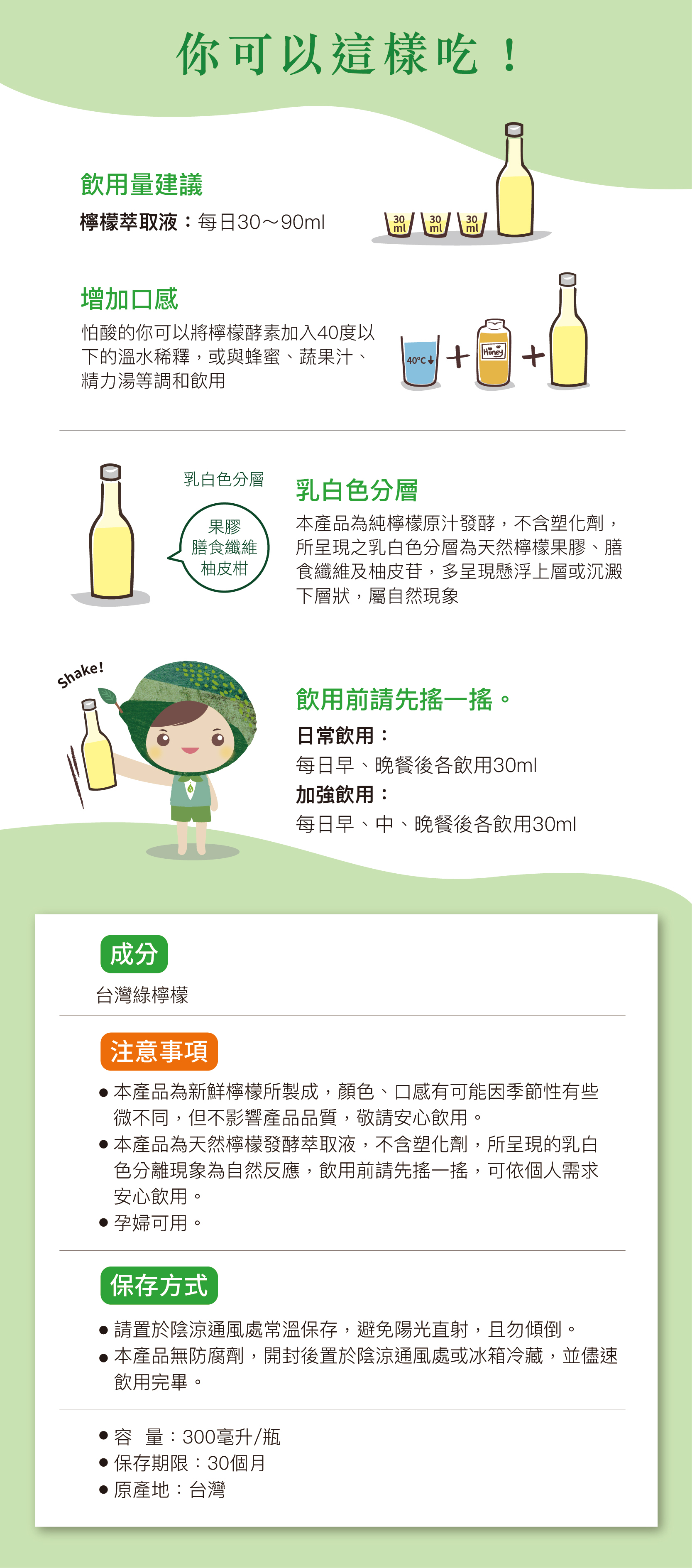 食用方法:每日1-3次,每次30CC,直接飲用或兌水稀釋,腸胃敏感者可餐後飲用